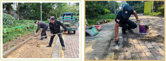 为确保工程质量与效率,服务处组建了由维修员、长效管理员、保安队长组成的专项施工团队,明确分工、倒排工期。施工前,团队反复优化方案,确定“拆除清理—拉线定位—红砖铺设—加固收尾”的作业流程。施工中,长效管理员力师傅与保安队长吴文召率先完成老化路面拆除、尘土清运,为铺设工作筑牢基础;维修戴师傅与吴文召默契配合,严格按标线拼接红砖,对圆弧过渡、转角等细节精雕细琢,还用半块砖围合绿化带边缘,再嵌入水泥黄沙加固,确保路面平整牢固、美观实用。